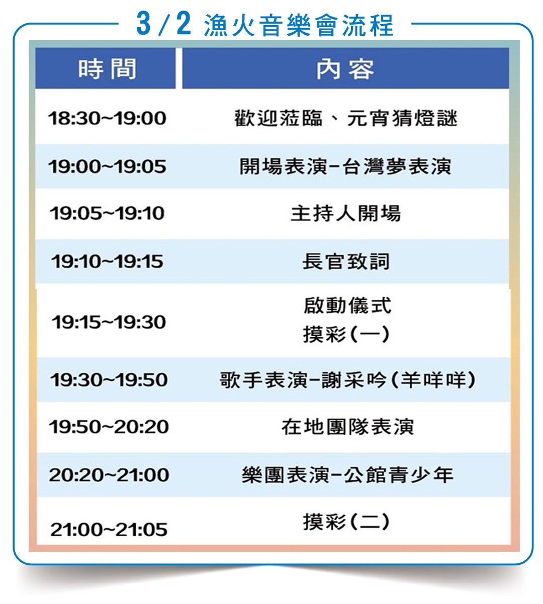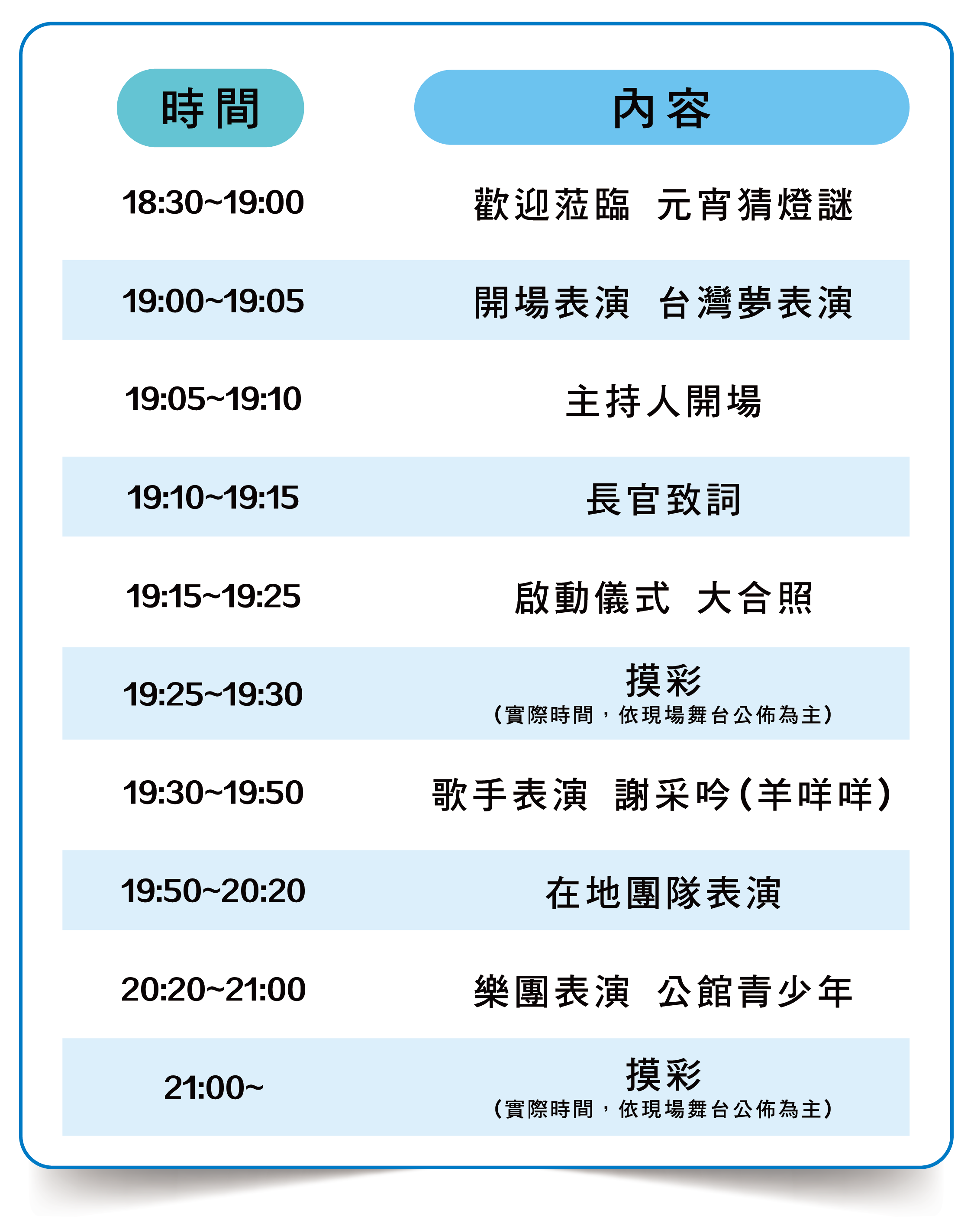 作為神明淨港文化祭的夜間暖場,特別邀請中職樂天女孩啦啦隊人氣成員琳妲擔任主持人,並集結多組特色演出團體。表演陣容包括來自東港、有「羊咩咩歌后」之稱的謝采吟,擅長唱出青春煩惱與自我認同的新生代樂團「公館青少年」,以及萬里在地社區表演團體,以多元音樂演出與互動形式,展現海港文化的生命力與豐富樣貌。